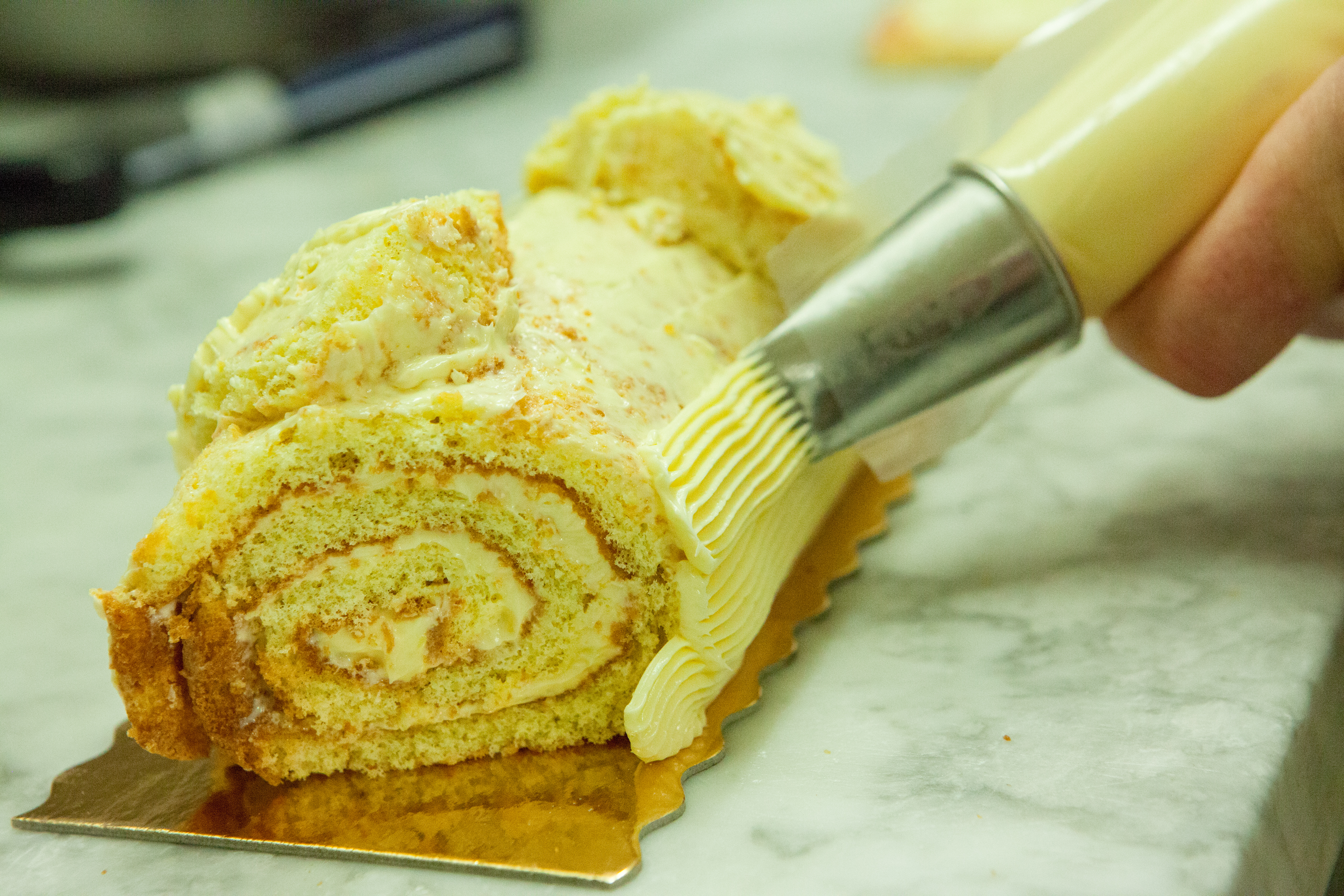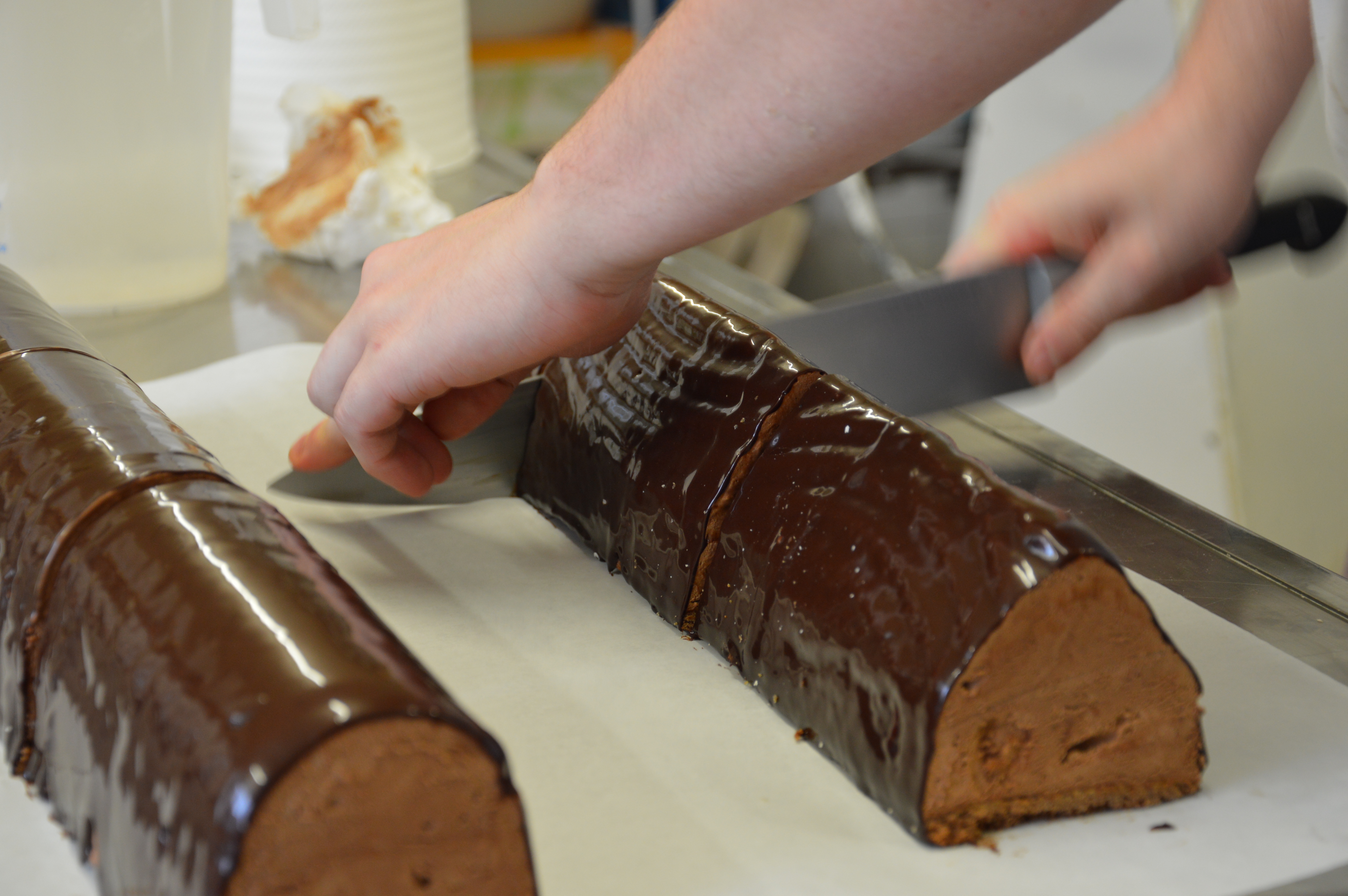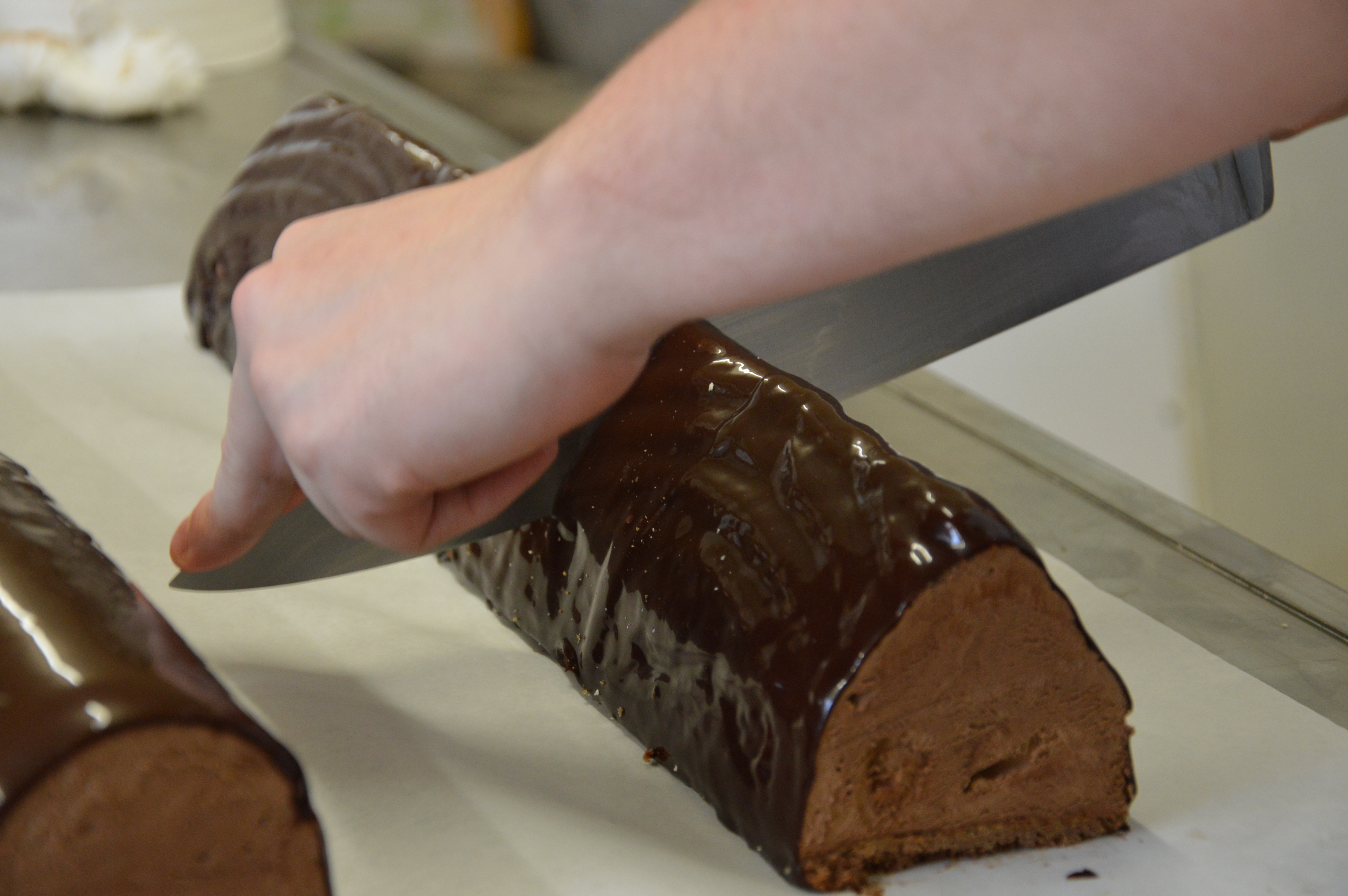 Chez Pains et Kouign nous fabriquons l’ensemble de nos produits dans nos labos de boulangerie et pâtisserie. Beaucoup d’animation et de mains qui s’y agitent en ces veilles de fêtes. Honneur à la bûche aujourd’hui et notamment la bûche crème au beurre vanille !